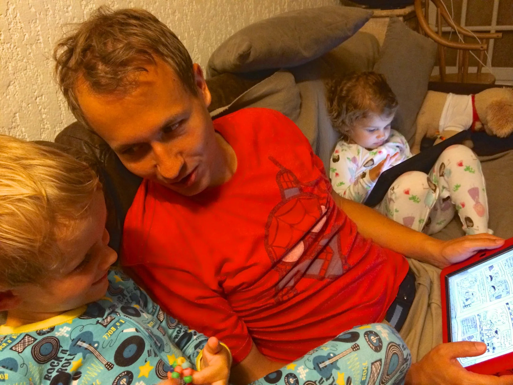 Daddy reading Kian Captain Underpants while Hannah looks through her Princess Adventures book.