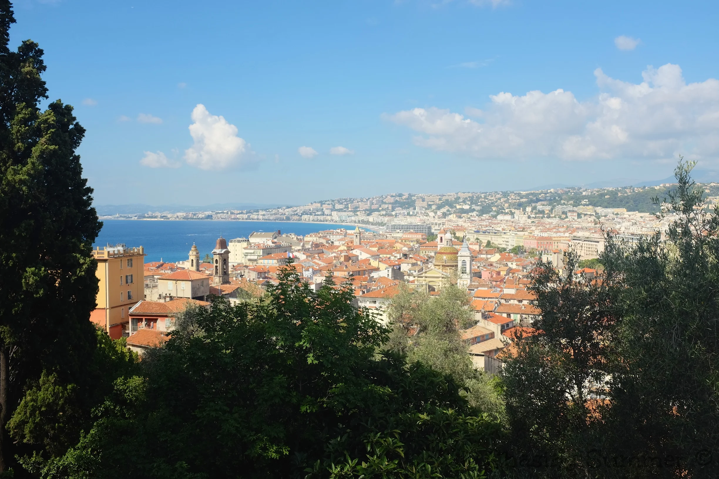 1) You can walk near the eastern end of the Quai des Etats-Unis, and you will find the steps leading up the hill to the Parc du Chateau. This might save you time as it is more direct, but be warned there are a lot of stairs. It is best to use these steps to head down, after your visit, as it brings you right by the beach.